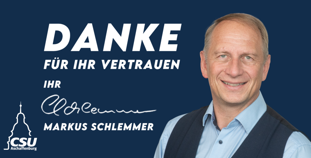 Wir bedanken uns bei allen Wählerinnen und Wählern für das grandiose Ergebnis bei der Stichwahl um das Amt des Oberbürgermeisters. Mit Bürgernähe, Zugewandtheit und klaren Positionen hat Markus Schlemmer die Menschen in Aschaffenburg überzeugt. Er wird die Aufgaben genau so anpacken: Offen für den Dialog auf Augenhöhe und entschieden in der Sache!